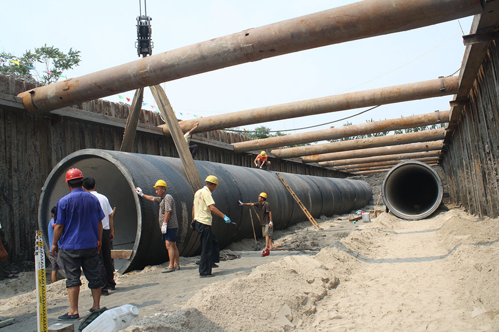 東郊污水處理廠是亞洲在建的半地下污水處理廠,建成后污水處理能力為60萬噸/天,再生水能力10萬噸/天,承擔(dān)著城市污水凈化的使命。澤寶公司負(fù)責(zé)供貨的進(jìn)水、再生水管網(wǎng)項(xiàng)目是該工程的重要組成部分。該段頂管是本市乃至華北地區(qū)達(dá)到直徑4米的頂管項(xiàng)目,采用外徑4.8米內(nèi)徑4米混凝土套管內(nèi)穿直徑3米玻璃鋼夾砂管的形式穿越京津塘高速高架,穿越距離長達(dá)131米。